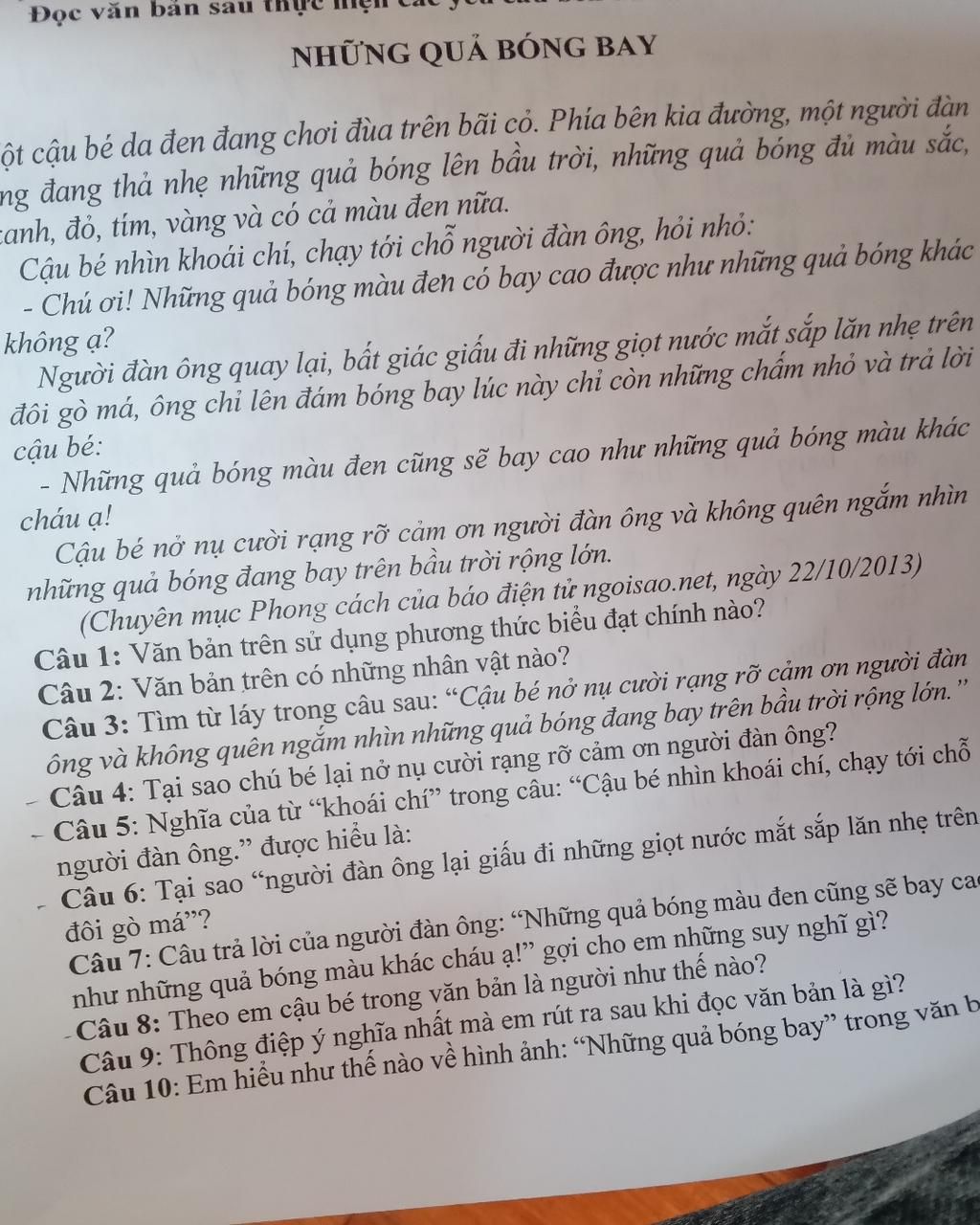 Cậu bé nở nụ cười rạng rỡ vì : Người thả bóng bay đã trả lời cậu bé rất nhẹ nhàng và tử tế mà không hề phân biệt . Còn vì những quả bóng đen cũng bay cao như những quả bóng khác. Đó không chỉ đơn giản là câu trả lời cho câu bé , mà còn là trả lời cho câu hỏi trong lòng cậu '' Người da đen có giống như những người có màu da khác không?'' Nụ cười của cậu là niềm vui,vui vì sự trân trọng và không hề phân biệt chủng tộc của người thả bóng bay
