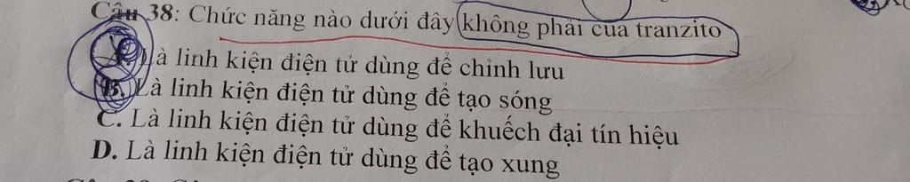 `-` Chức năng nào dưới đây không phải của tranzito là linh kiện điện tử dùng để chỉnh lưu. Transistor chủ yếu dùng để khuếch đại tín hiệu, tạo xung, tạo sóng, đóng mở dòng điện trong các mạch điện tử.