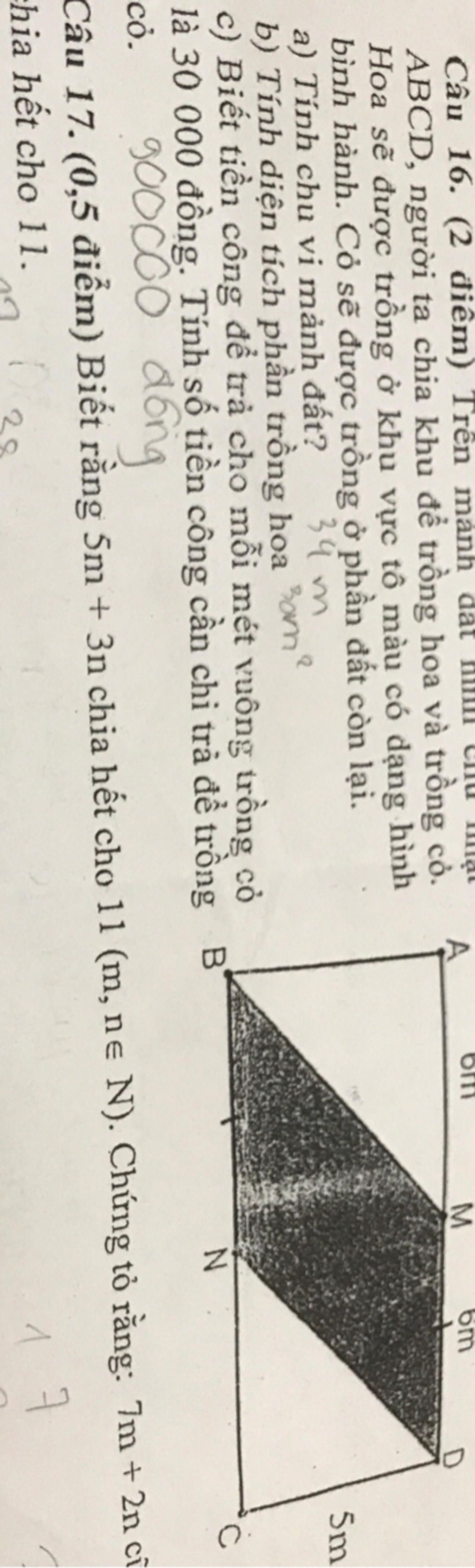 b ) Diện tích phần trồng hoa là : 6 x 5 = 30 ( m2 )