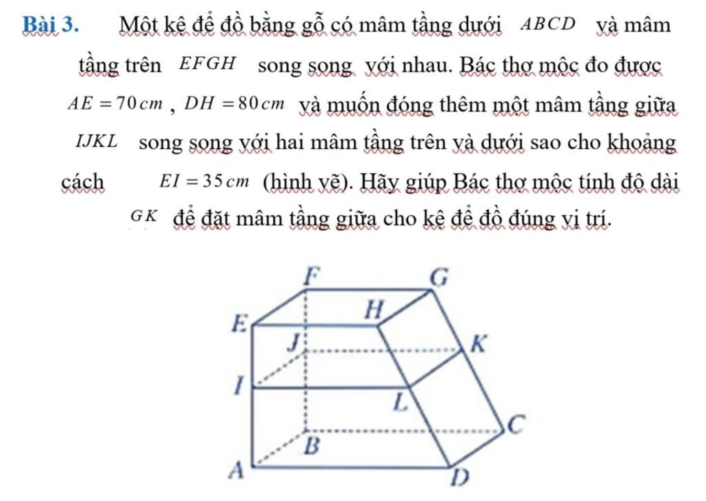 $\begin{array}{l} \dfrac{{EI}}{{EA}} = \dfrac{{HL}}{{HD}} = \dfrac{{GK}}{{GC}}\\ \Rightarrow \dfrac{{35}}{{70}} = \dfrac{{HL}}{{80}} = \dfrac{{GK}}{{GC}}\\ \Rightarrow HL = 40\left( {cm} \right) \end{array}$