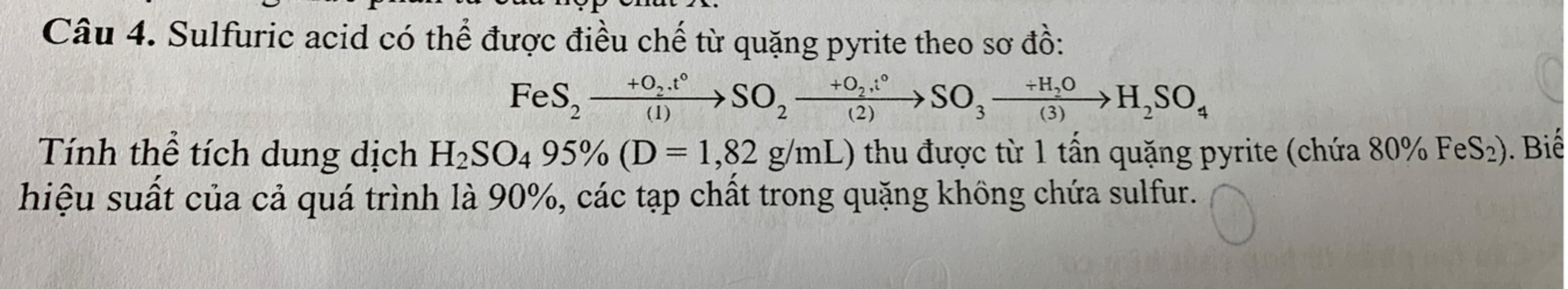 $n_{H_2SO_4,thực}=\dfrac{2 \times 10^5}{15} \times \dfrac{90}{100}=0.12 \times 10^5(mol)$