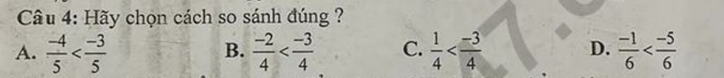`B` sai vì : `-2 > -3 => -2/4 > -3/4`