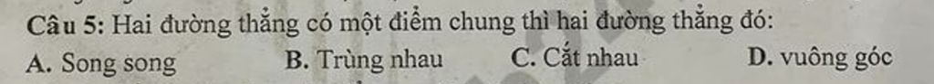 `=>` Hai đường thẳng có một điểm chung thì hai đường thẳng đó là `2` đường thẳng cắt nhau.