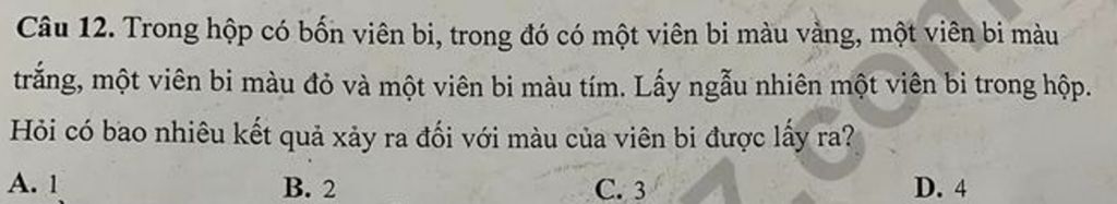 Khi lấy ngẫu nhiên một viên bi, có `4` kết quả có thể xảy ra đối với màu của viên bi được lấy ra, đó là: màu vàng, màu trắng, màu đỏ, màu tím.