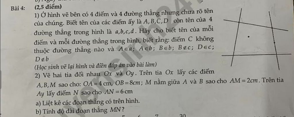 1) Ở hình vẽ bên có 4 điểm và 4 đường thẳng nhưng chưa rõ tên của chúng. Biết tên của các điểm ấy là A,B,C,D còn tên của 4 đường thẳng trong hình là a,b,c,d. Hãy cho biết tên của mỗi điểm và mỗi đường thẳng trong hình, biết rằng: điểm C không thuộc đường thẳng nào và A$\in$a; A$\in$b; B$\in$b; B$\in$c; D$\in$c; D$\in$ C.