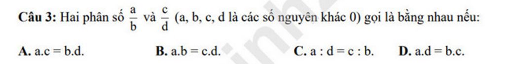 Hai phân số `a/b` và `c/d` `(a,b,c,d\inZZ\ne0)` gọi là bằng nhau khi tích của chúng `a.d=b.c` .
