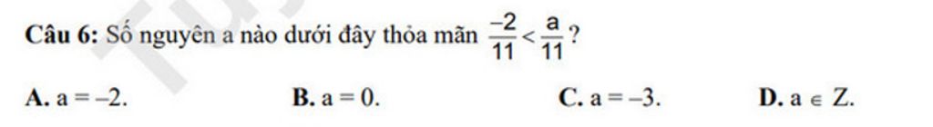 `=> ` Loại `A,C,D` vì `-2=-2; -3<-2; in ZZ` không liên quan