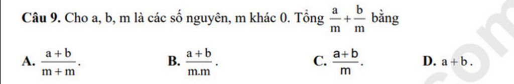 `->``C`$\\$ Vì muốn cộng hai phân số có cùng mẫu số, ta cộng hai tử số với nhau và giữ nguyên mẫu số.$\\$ `=>`$\text{$\dfrac{a}{m}$+$\dfrac{b}{m}$=$\dfrac{a+b}{m}$}$