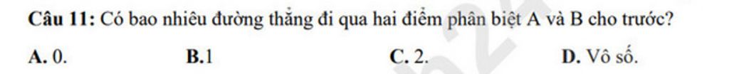 `→` Theo tiên đề Ơ-clit: Qua `1` điểm nằm ngoài đường thẳng thì chỉ có `1` đường thẳng song song với đường thẳng cho trước.