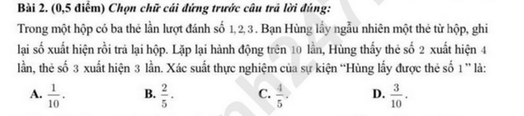 Giải thích các bước giải:Vì thẻ 2 có 4 lần ,thẻ 3 có 3 lần mà tổng lần bốc là 10 lần cho nên: