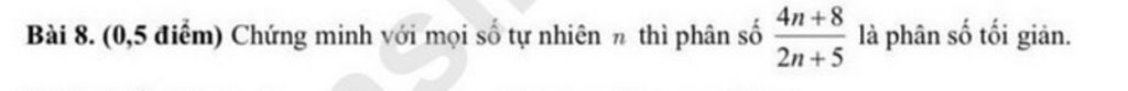 Do đó: Phân số `\frac{4n+8}{2n+5}` là phân số tối giản.