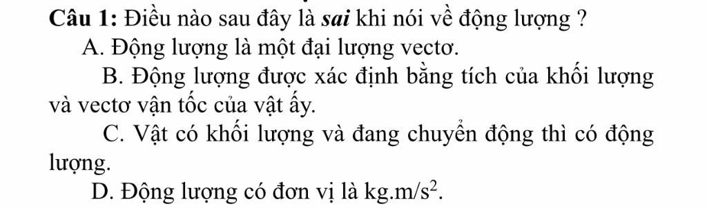 Câu 1: Điều nào sau đây là sai khi nói về động lượng ?