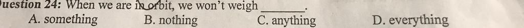 `-` "Nothing" có nghĩa là "không có gì" hoặc "một thứ gì cả." Chúng ta sử dụng "nothing" để nói về sự vắng mặt hoặc tình trạng không có cái gì cả.