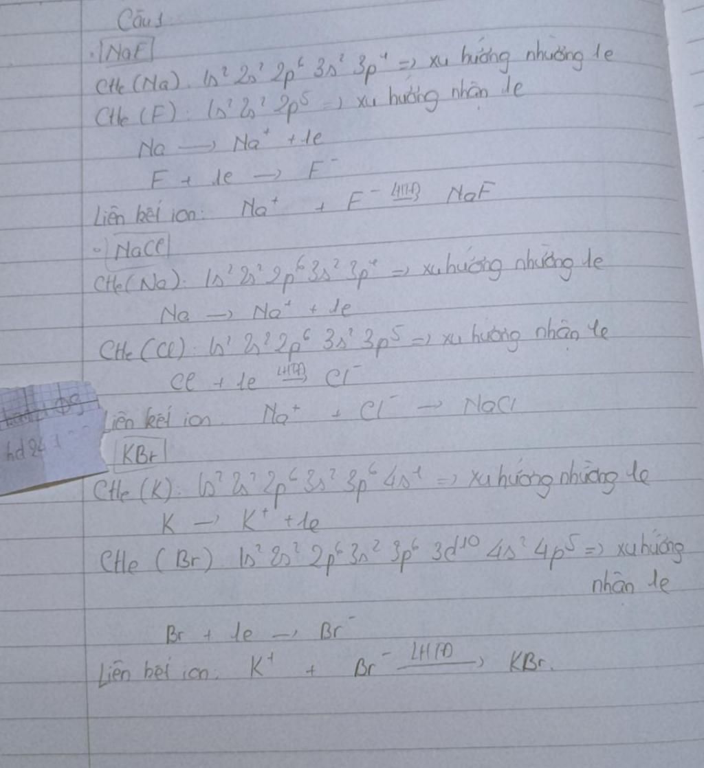 Câu 1 Giải thích sự hình thành liên kết ion trong phân tử sodium fluoride NaF, NaCl, KBr.