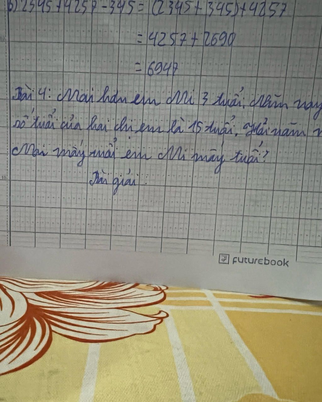 Mai hơn mi 3 tuổi. Năm nay so tuổi của hai chị em là 15 tuổi.hoi năm nay mai mấy tuổi em mi mấy tuổi