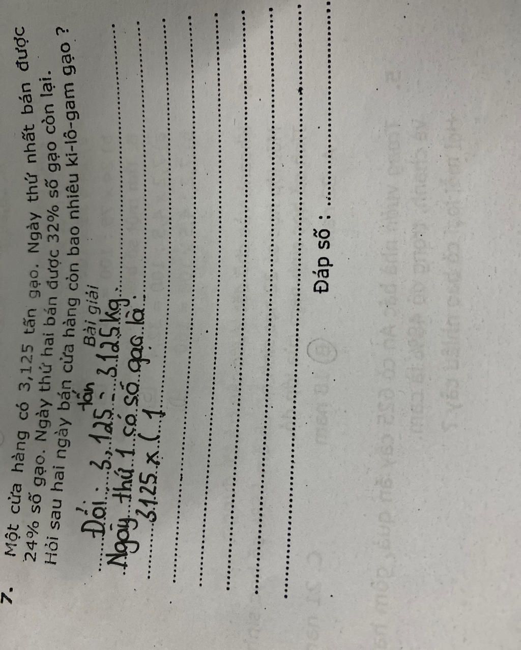 Đổi `3,125` tấn `= 3125 kg`