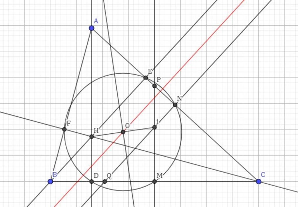 Vẽ ba đường cao `AD, BE, CF` của `ΔABC` nhọn. Đường tròn qua `D, E, F` cắt `AC, BC` tại `N, M.` Kẻ `MP bot BC, NQ bot AC` với `P in AC, Q in BC.` `O` là trung điểm của đoạn thẳng `HI` biết trực tâm `H` của `Delta ABC` và `I = MP nn NQ.` Chứng minh `O` thuộc đường trung trực của `NE.`