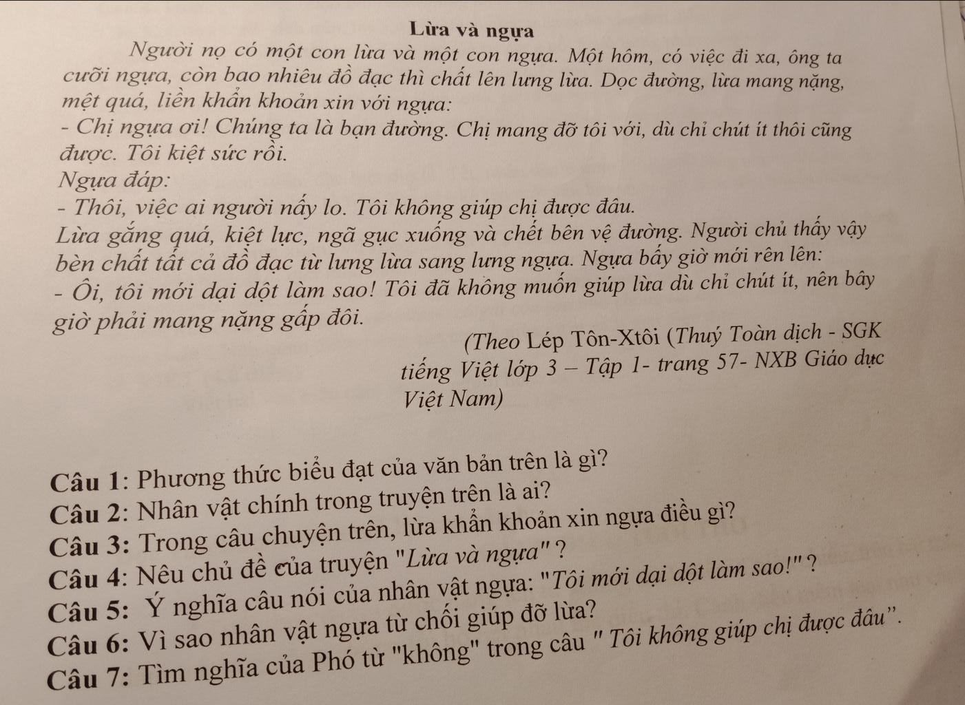 Câu 1:Tự sự ; Câu 2:Nhân vật chính là lừa và ngựa ; Câu 3:Lừa khẩn khoản xin ngựa mang bớt đồ đạt,dù một ít thôi cũng được ; Câu 4:Chủ đề của câu chuyện trên là sự ích kỷ của ngựa ; Câu 5:Ý nghĩa của câu nói đó là sự ích kỷ của ngựa đã khiến mình phải mang nhiều đồ trên lưng,mệt mỏi hơn mới hiểu được cảm giác của lừa nên hối hận vì lúc đó mình đã không chịu giúp lừa dù chỉ một ít ; Câu 6:Vì nhân vật ngựa ích kỷ,chỉ biết nghĩ cho bản thân mình không muốn giúp đỡ lừa,sợ mình bị thiệt nên không giúp lừa ; Câu 7:Nghĩ của phó từ là nêu lên sự ích kỷ và nói rõ là ngựa không muốn giúp lừa.
