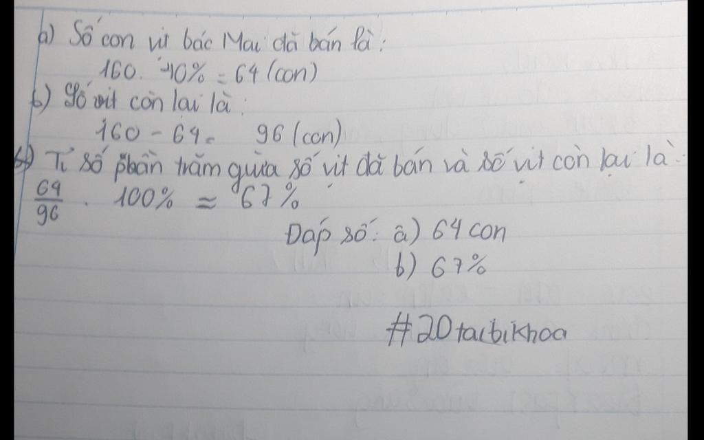 Bài sửa Số vịt còn lại mà bác Mai có là: `160xx(100-40)% = 96` (con vịt) số con vịt còn lại là: `160-96=64`(con vịt) số phần trăm con vịt còn lại là: `64:96 xx 100% = 67%` `đáp số : `a) 64` con vịt `b) 67%`