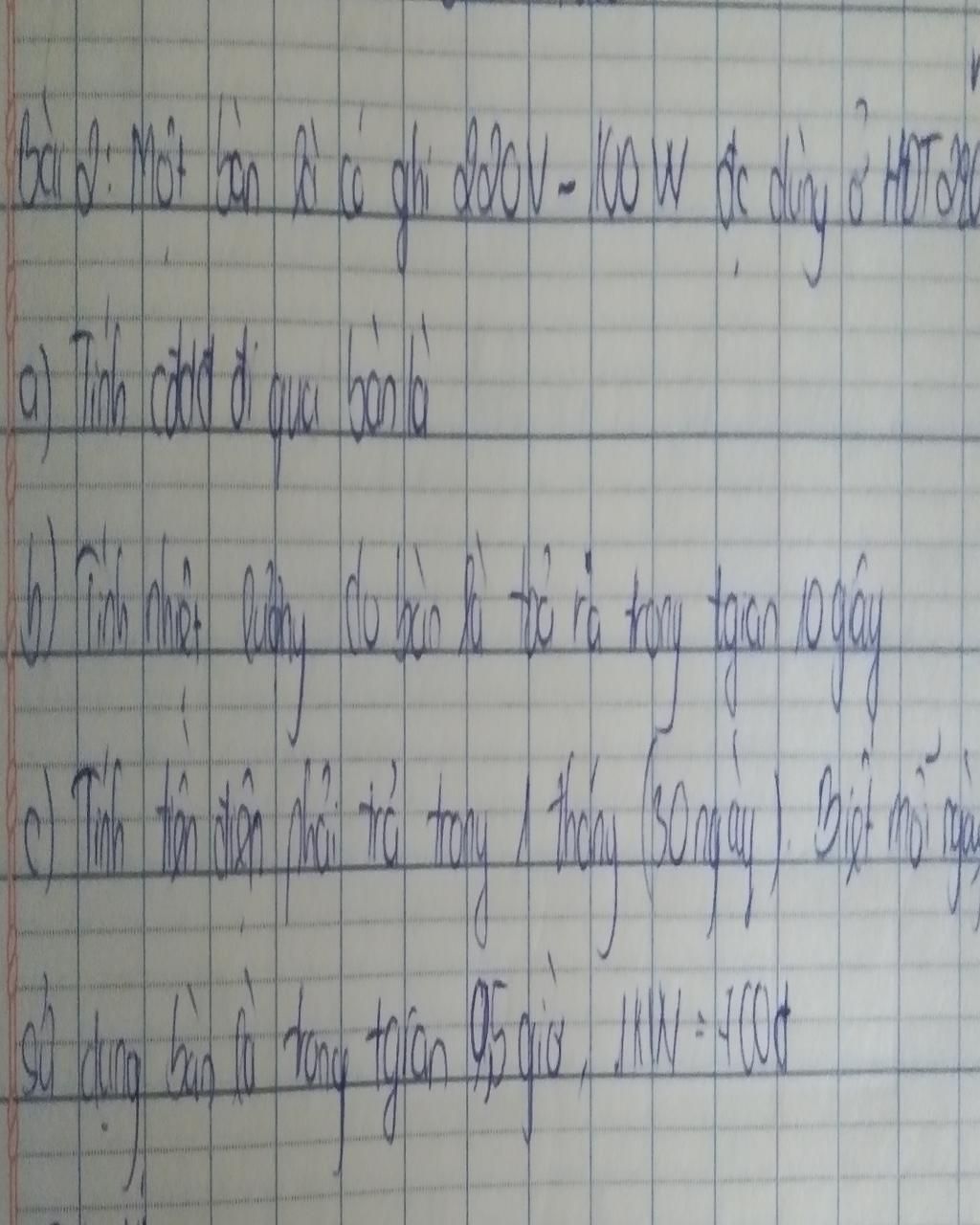 1. Một bàn là có ghi 220V-100W được dùng ở HĐT 220Va, tính cddd đi qua bàn làb, tính nhiệt lượng do bàn là toả ra trong thời gian 10 giâyc, tính tiền điện phải trả trong 1 tháng (30ngày) . Biết mỗi ngày sử dụng bàn là trong thời gian 0,5 giờ , 1kW=700đ