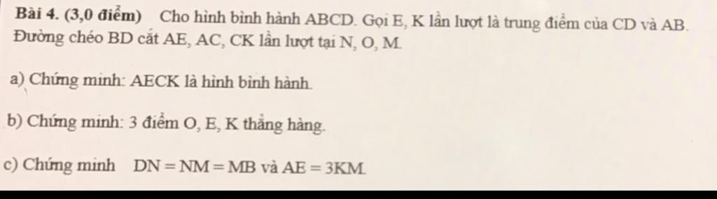 Xét` `ΔNOE` `và` `MOK` `→` `OE=OK` `(O` `trung` `điểm` `EK)` `;` `∠NOE=∠MOK` `(đối` `đỉnh)` `;` `∠NEO=∠MKO` `(so` `le` `trong` `AE//CK)