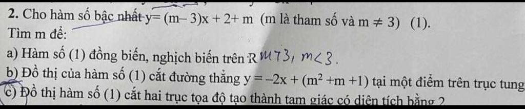 2. Cho hàm số bậc nhất y= (m−3)x + 2+ m (m là tham số và m = 3) (1).
