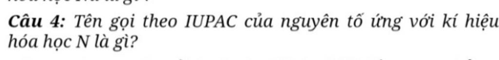 Tên gọi theo IUPAC của nguyên tố ứng với kí hiệu hóa học N là nitrogen