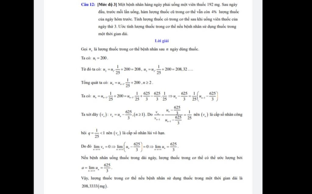 Câu 12: [Mức độ 3| Một bệnh nhân hàng ngày phải uống một viên thuốc 192 mg. Sau ngày