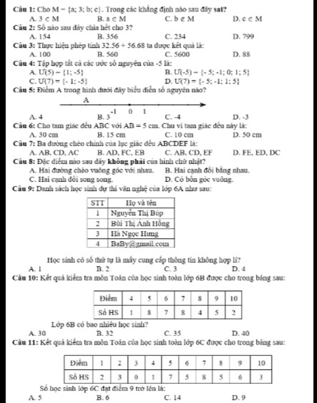 Câu 1: Cho M − {3; 3; b; c) . Trong các khẳng định nào sau đây sai?