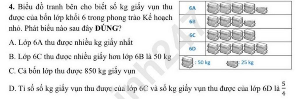 `bbC.` Cả bốn lớp thu được `850kg` `->` Đúng
