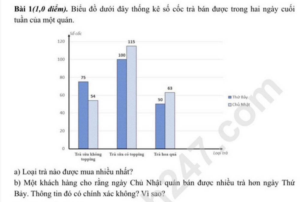 `a . ` Dựa vào biểu đồ có trong đề chúng ta có thể thấy được loại trà được mua nhiều nhất là loại trà sữa có topping .