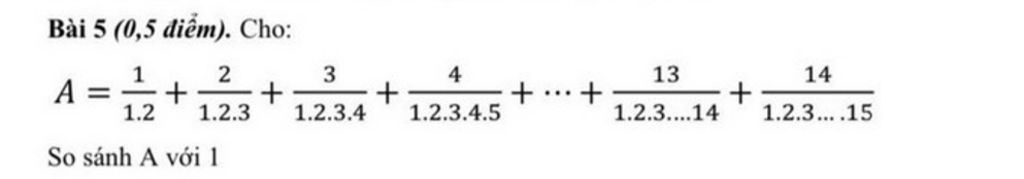 Ta có: `A = 1/(1.2) + 2/(1.2.3) + 3/(1.2.3.4) + 4/(1.2.3.4.5) + ... + 13/(1.2.3.....14) + 14/(1.2.3.4.....15)`