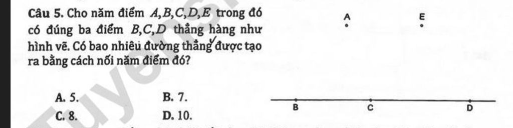 Nối `5` điểm lại với nhau sẽ có `10` đoạn thẳng là :