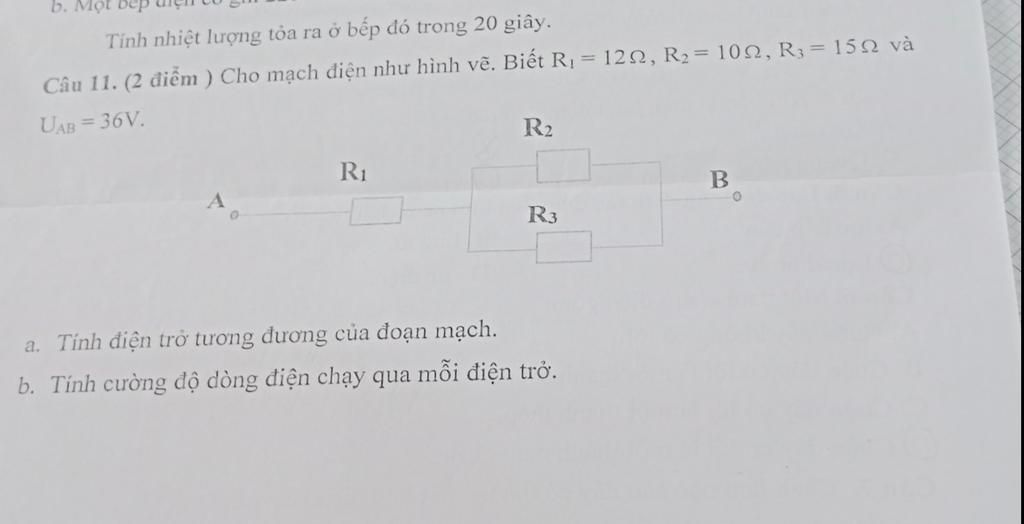 Cường độ dòng điện qua `R_{3}`: `I_{3}`=`U_{3}/R_{3}` = `12/15` = `0,8` (`A`)