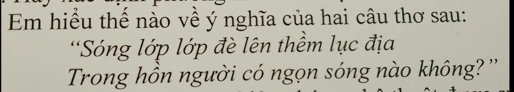''Sóng'' ở đây không chỉ là những con sóng biển bình thường , không phải là những gợn nước đập vào bờ biển . '' Sóng " ở câu thơ là hình ảnh ẩn dụ cho những thách thức , những hiểm nguy mà biển đảo đất nước đang phải đối mặt nói riêng và những nguy hiểm tiềm ẩn mà đất nước có thể sẽ phải đương đầu nói chung . ''Sóng'' ở câu thơ thứ hai cũng vẫn là hình ảnh ẩn dụ . Nhưng lần này là ẩn dụ cho sự gan dạ , tinh thần lạc quan , bất khuất sẵn sàng chiến đấu , hi sinh vì Tổ quốc . Kết hợp với câu hỏi tu từ ''có ngọn sóng nào không?" để hỏi mỗi người lính rằng : liệu sóng tâm hồn của họ có đủ mạnh mẽ để đánh tan sóng ngoại bang kia hay không ? Đất nước ta đã độ lập nên nhiều người có suy nghĩ rằng : độc lập rồi , hòa bình rồi thì cần gì yêu nước nữa ? Đúng là đất nước ta đã độc lập, đã hòa bình nhưng tình yêu nước thì vẫn luôn còn đó . Trải qua nghìn năm Bắc thuộc , nhiều thập kỉ chịu sự xâm lăng của thực dân mà tinh thần yêu nước ấy vẫn chẳng hề suy mà còn thịnh hơn rất nhiều . Không phải chỉ khi đất nước lâm nguy thì mới cần yêu nước mà tình yêu nước cũng phải như sóng biển kia , luôn dạt dào , luôn ồ ạt và mãi mãi.