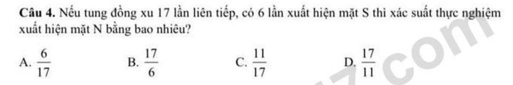 Câu 4. Nếu tung đồng xu 17 lần liên tiếp, có 6 lần xuất hiện mặt S thì xác suất thực nghiệm xuất hiện mặt N bằng bao nhiêu?