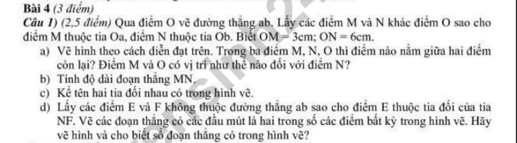 Câu 1) (2,5 điểm) Qua điểm O vẽ đường thẳng ab. Lấy các điểm M và N khác điểm O sao cho điểm M thuộc tia Oa, điểm N thuộc tia Ob. Biết OM = 3cm; ON=6cm.
