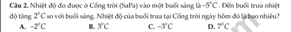 Câu 2. Nhiệt độ đo được ở Cổng trời (SaPa) vào một buổi sáng là−5°C. Đến buổi trưa nhiệt độ tăng 2°C so với buổi sáng. Nhiệt độ của buổi trưa tại Cổng trời ngày hôm đó là bao nhiêu?