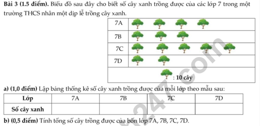 \begin{array}{|c|c|c|}\hline \text{Lớp}&\text{7A}&\text{7B}&\text{7C}&\text{7D}\\\hline \text{Số cây xanh}&\text{40}&\text{30}&\text{50}&\text{20}\\\hline\end{array}
