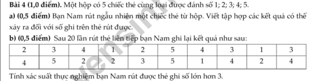 `=>` Xác suất thực nghiệm bạn Nam rút được thẻ ghi số lớn hơn `3` là: