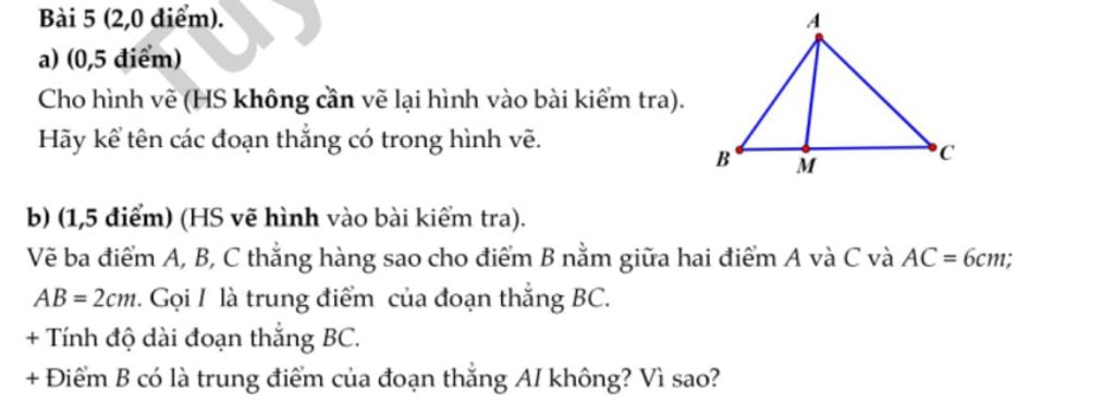 a) (0,5 điểm) Cho hình vẽ (HS không cần vẽ lại hình vào bài kiểm tra). Hãy kể tên các đoạn thẳng có trong hình vẽ.