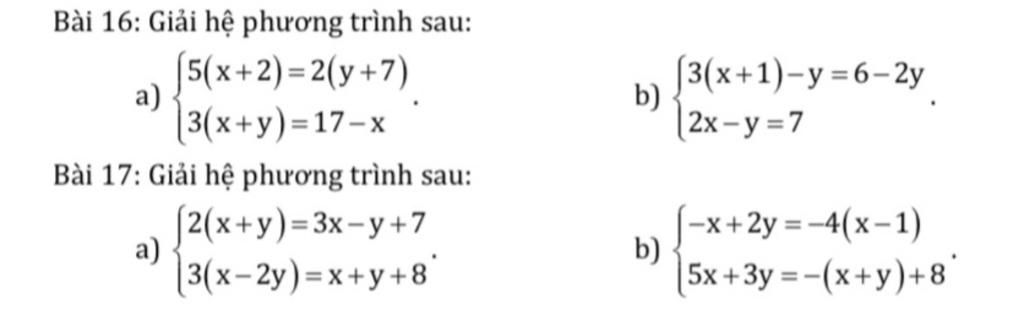 `a) {(5(x+2)=2(y+7)) , (3(x+y)=17-x):}`