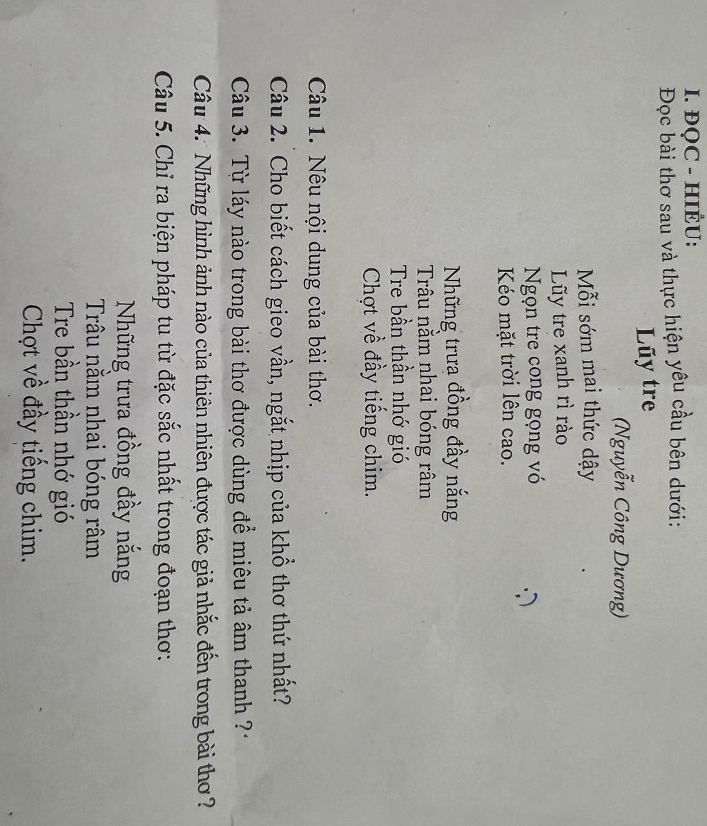 4. Những hình ảnh thiên nhiên trong bài thơ: lũy tre xanh, ngọn tre cong, mặt trời, trưa nắng ngoài đồng, trâu nằm, gió, tiếng chim