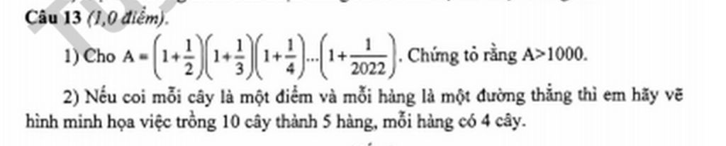`A = (1 + 1/2) (1 + 1/3) (1 + 1/4) ... (1 + 1/2022) = 3/2 . 4/3 . 5/4 . ... . 2023/2022 = (3.4.5. ... . 2023)/(2 . 3 . 4 . ... . 2022) = 2023/2 = 1011,5 > 1000`