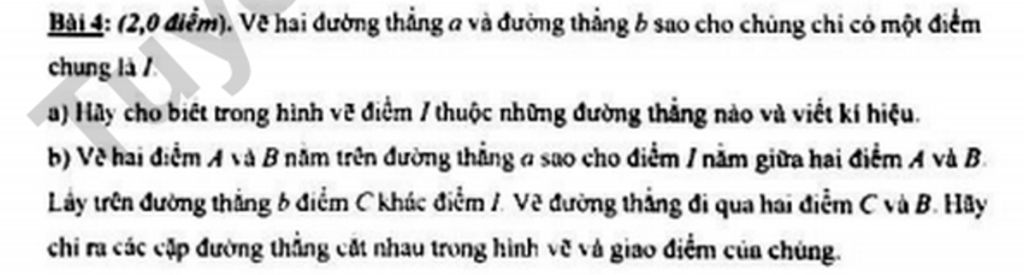 Bài 4: (2,0 điểm). Vẽ hai đường thẳng a và đường thẳng b sao cho chúng chỉ có một điểm chung là 7.