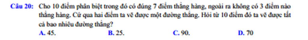 Trong hình có 10 điểm phân biệt có đúng 7 điểm thẳng hàng nhưng lại không có ba điểm nào thẳng hàng với nhau, suy ra số đường thẳng ta có thể vẽ được là: `(10 . (10 - 1))/2 = 45` (đường thẳng)