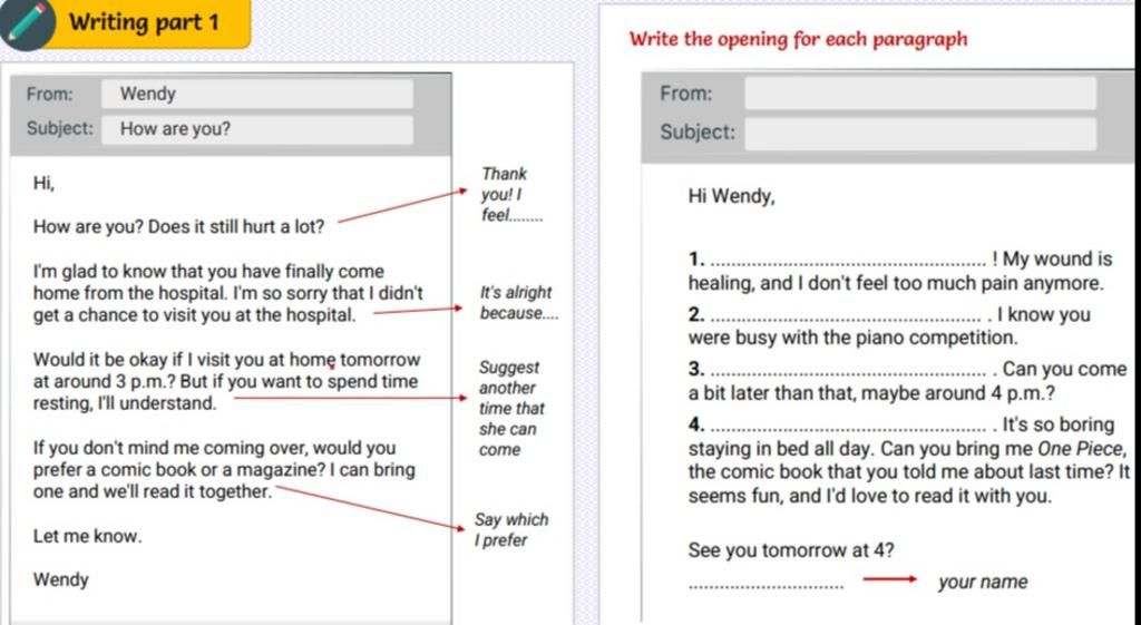 Thank you for your concern. I’m feeling much better now. My wound is healing, and I don’t feel too much pain anymore. It’s alright that you couldn’t visit me at the hospital because I know you were busy with the piano competition.