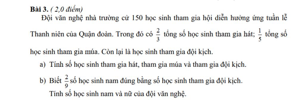 Vậy có `90` học sinh nam và `60` học sinh nữ tham gia đội văn nghệ.
