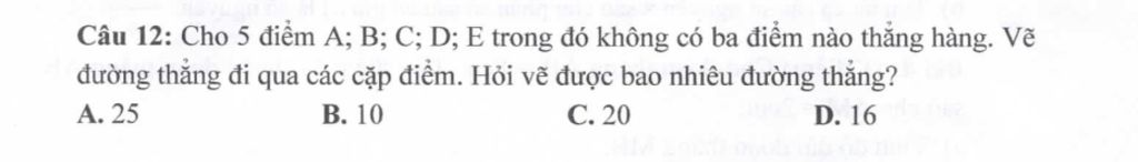 Qua `n` điểm không có `3` điểm nào thằng hàng vẽ được `(n(n-1))/2` đường thẳng đi qua các cặp điểm