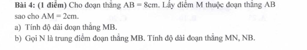 Bài 4: (1 điểm) Cho đoạn thẳng AB = 8cm. Lấy điểm M thuộc đoạn thẳng AB